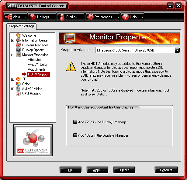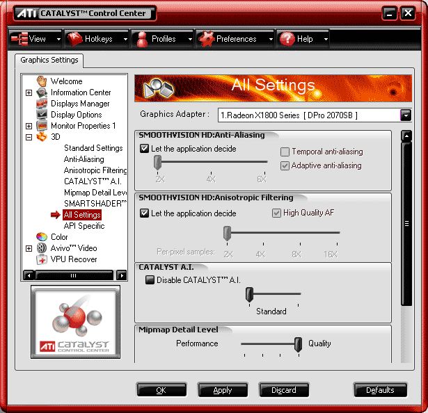 По сути, контрольная панель драйверов особых изменений не претерпела, добавилось лишь меню по AVIVO (о нем в пятой части материала), в 3D-настройках появились новые опции для Adaptive AA и HQ Aniso. Надо отметить, что улучшена работа карт с TV-out, есть режим вывода на ТВ (или второй приемник) полноэкранного изображения фильма или иного видеоролика (вне зависимости от выставленного на нем разрешения).