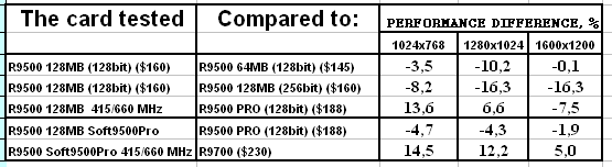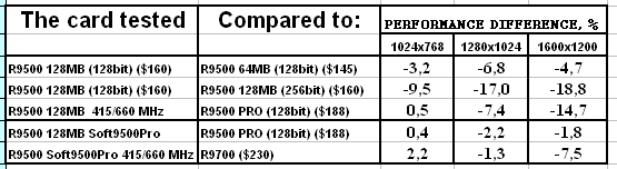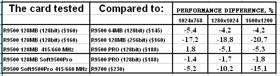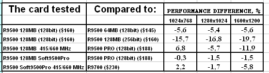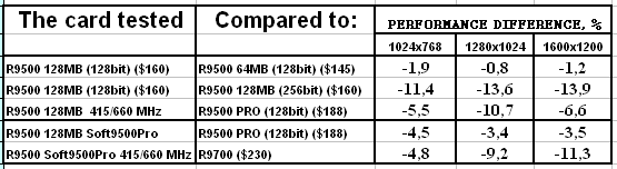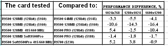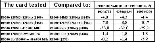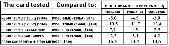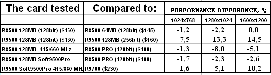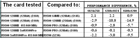 - Скорость у "нового" RADEON 9500 128MB оказалась ниже, чем даже у RADEON 9500 64MB. Вероятно это связано с таймингами памяти, которые у новой карты выше. Возможны и иные причины, но факт остается фактом: покупка обновленного RADEON 9500 128MB становится практически невыгодной, если не учитывать иные факторы, такие как разгон или переделку в RADEON 9500 PRO.