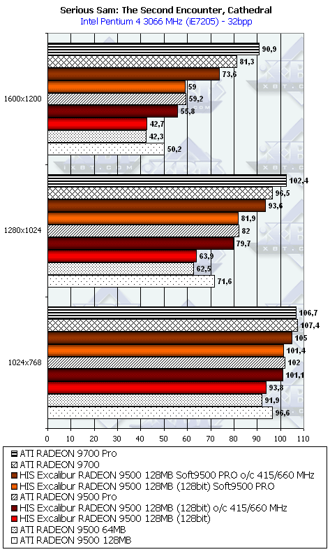 - Serious Sam: The Second Encounter v.1.05 (Croteam/GodGames) OpenGL, мультитекстурирование, Grand Cathedral demo, настройки тестирования: quality, S3TC OFF