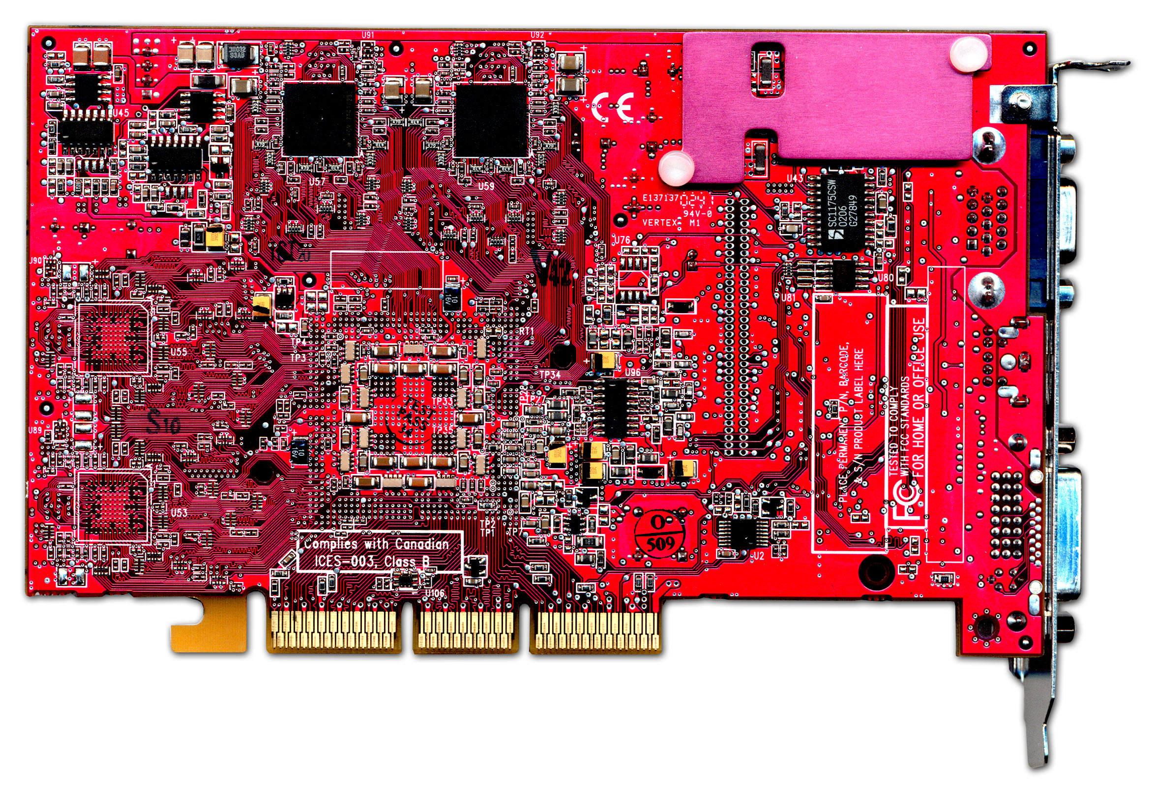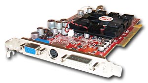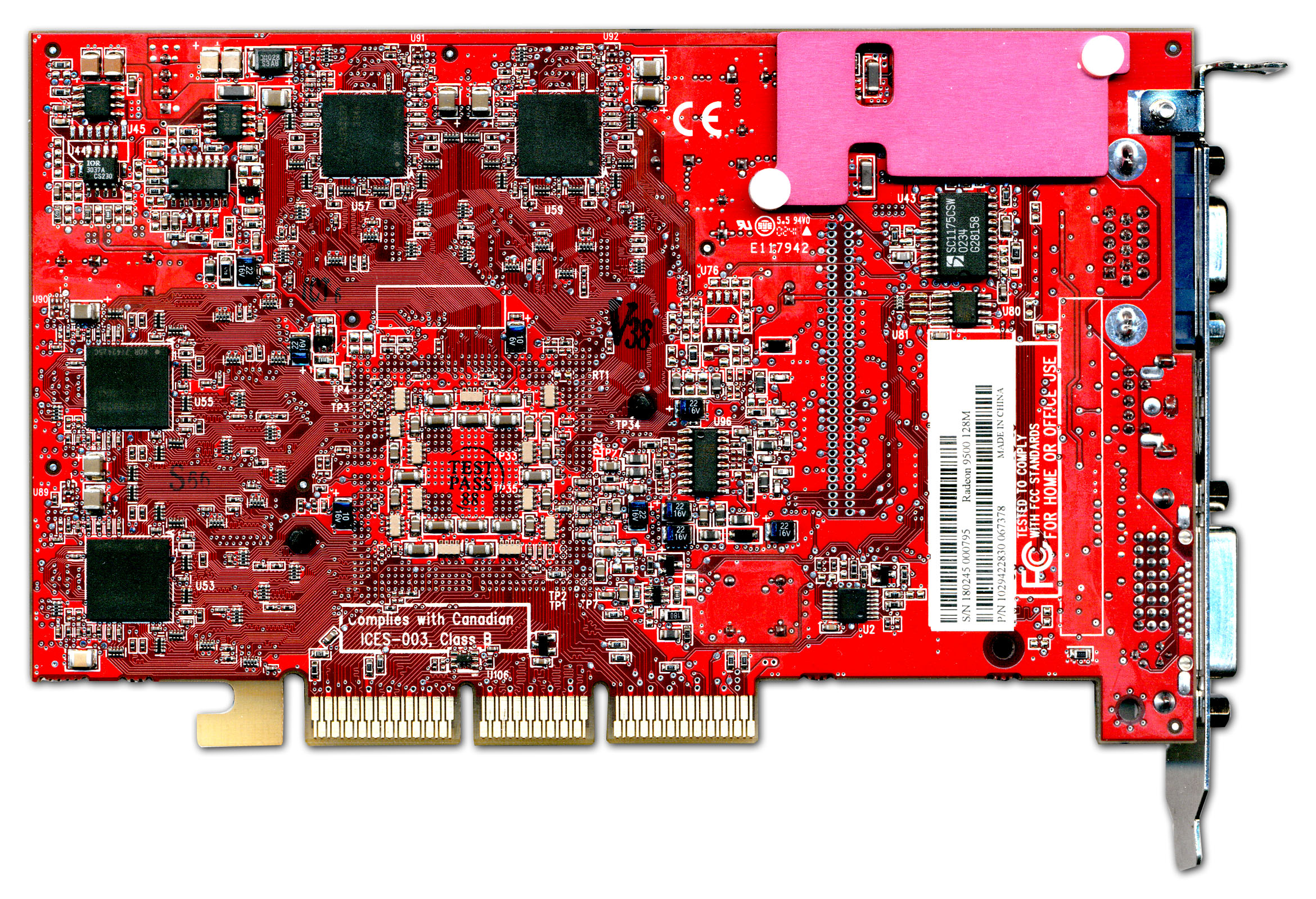 | Карта имеет интерфейс AGP x8/x4, 128 МБ памяти DDR SDRAM, размещенной в 8-ми микросхемах на обеих сторонах PCB. Микросхемы памяти производства Samsung (но все последние карты снабжены модулями от Hynix). Время выборки у микросхем памяти 2,8 ns, что соответствует частоте работы 357 (714) МГц, однако все последние карты имеют микросхемы со временем выборки 3.6 ns, что соответствует частоте 275 (550) МГц. Память же тактуется стандартными значениями частот  270 (540) МГц. GPU функционирует также на обычной для R9500 частоте 275 МГц. Шина обмена с памятью  256 bit (аппаратно). |  |