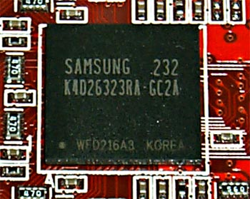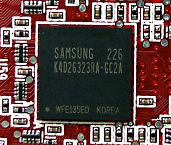 | Карта имеет интерфейс AGP x8/x4, 128 МБ памяти DDR SDRAM, размещенной в 8-ми микросхемах на обеих сторонах PCB. Микросхемы памяти производства Samsung. Время выборки у микросхем памяти 2.8 ns, что соответствует частоте работы 357 (714) МГц, память же работает на частоте  310 (620) МГц. GPU функционирует на обычной для R9700PRO частоте 325 МГц. |  |