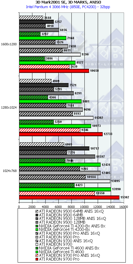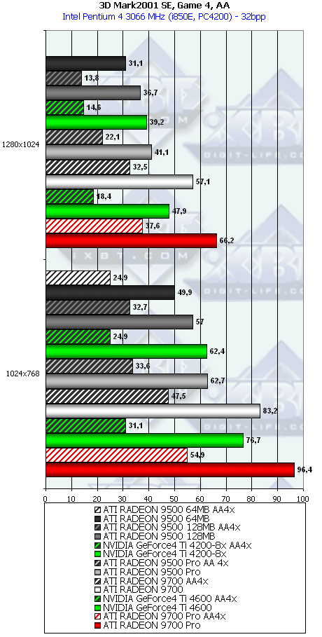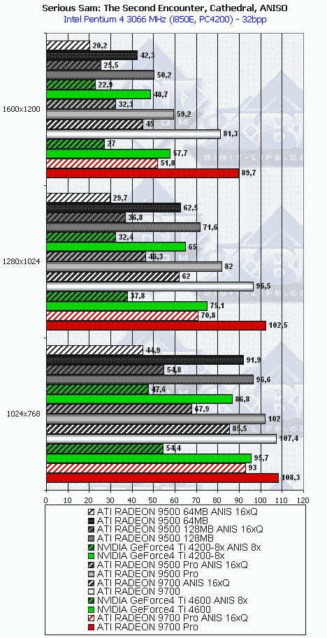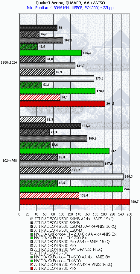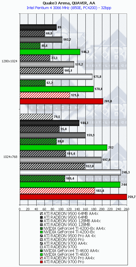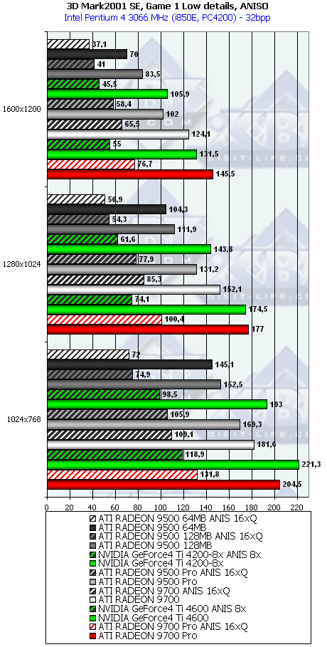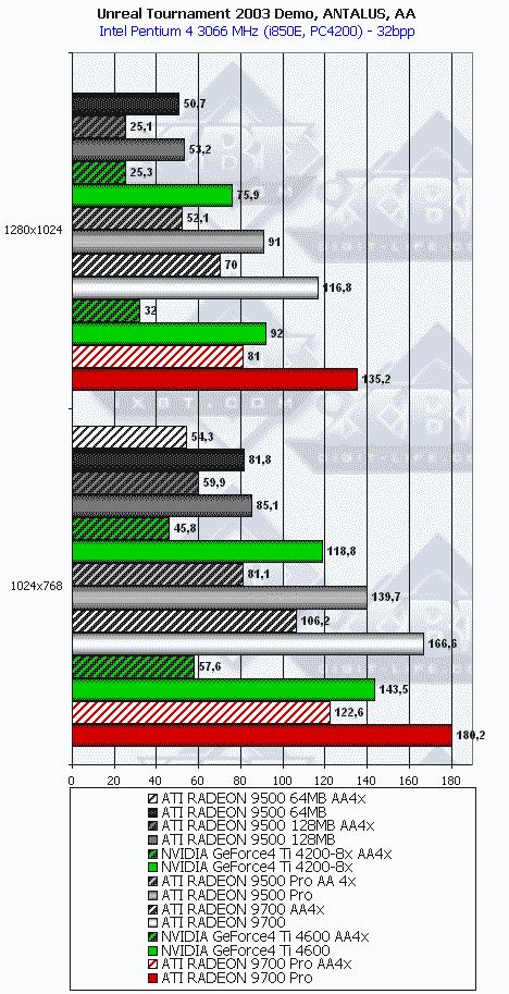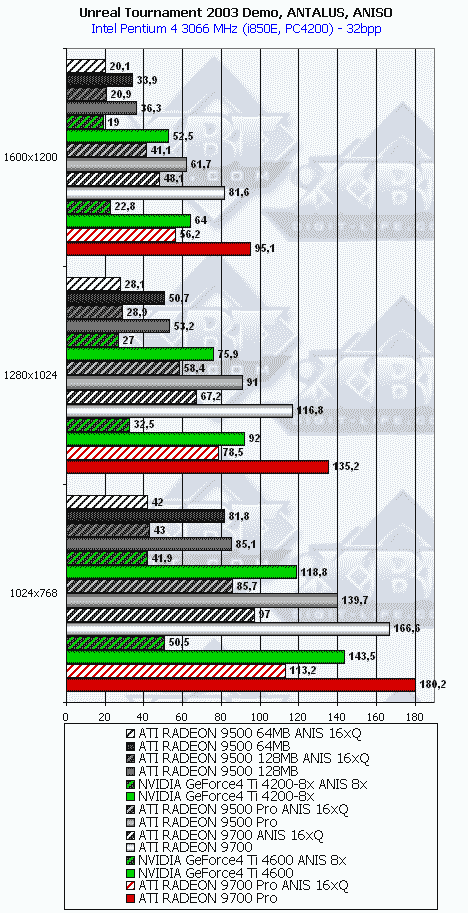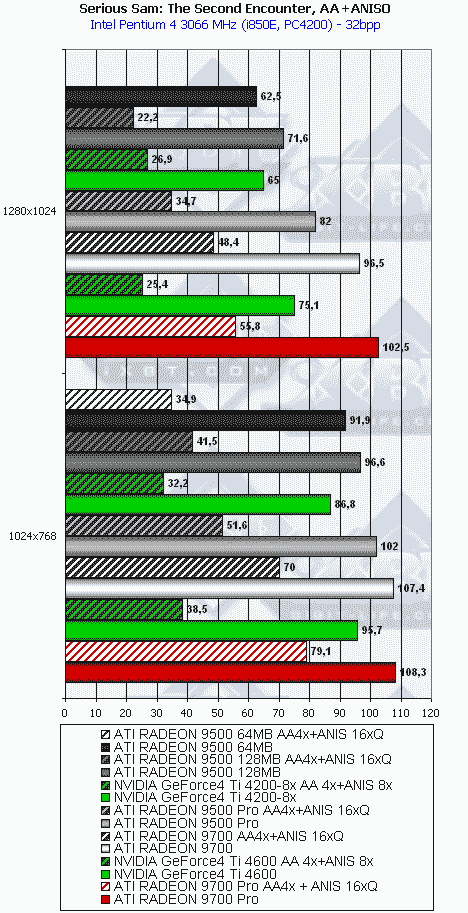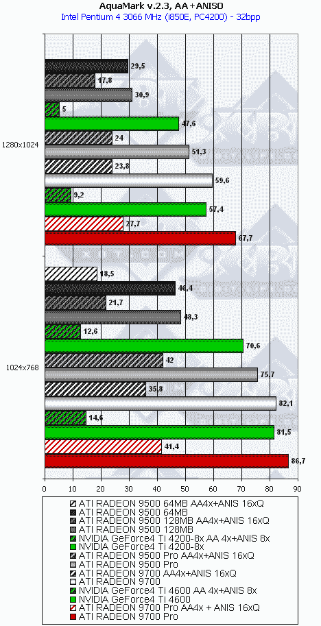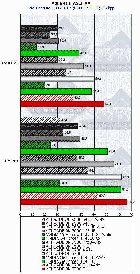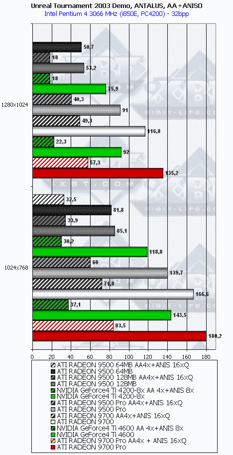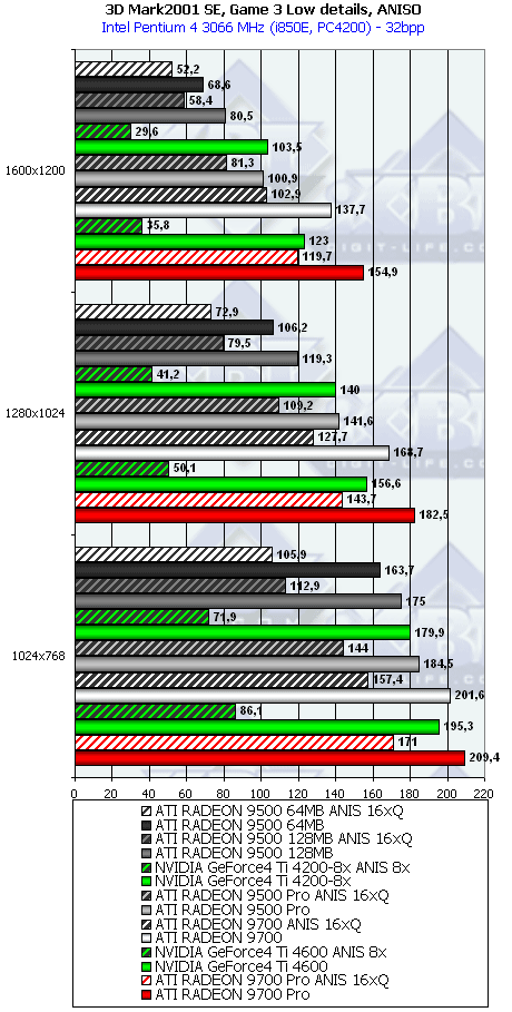А тут R9500 64MB проявил себя лучше, и хотя без АА и анизотропии все еще есть сильный проигрыш, но надо учитывать и разницу в цене, а также прекрасную победу при включенных АА и анизотропке. Разумеется, у R9500 128MB все еще радужнее. Да и в целом этот тест для всей линейки очень отраден.