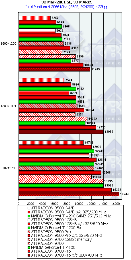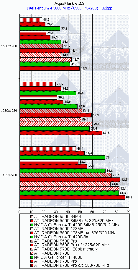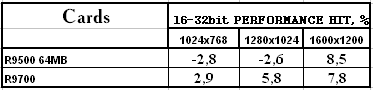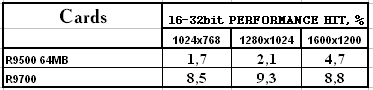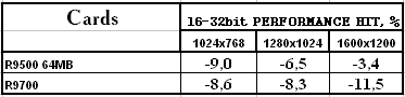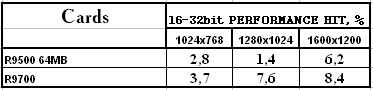Интересно отметить, что R9500 64MB (128bit)  более сбалансированная карта, для ее 4-х конвейеров рендеринга вполне хватает такой шины, если не использовать АА или анизотропию. А вот у R9700, несмотря на 256-битную шину, падение скорости при переходе из 16 в 32бита имеется, то есть 8-ми конвейерам, работающим на 275 МГц, требуется чуть более быстрая память.