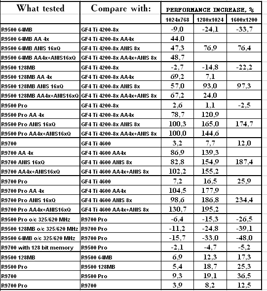 Сравнение с конкурентами из "стана NVIDIA" велось в жестком для карт от ATI режиме: всем, кроме, R9700 и R9700PRO, противопоставлялась плата на базе GeForce4 Ti 4200-8x, имеющая на начало 2003 года цену около $200 (то есть, RADEON 9500 64 и 128MB стОят дешевле). R9700 и 9700PRO соперничают с Ti 4600 (что логично, ибо в первом случае цены схожи, а во втором  просто не с кем больше соперничать).