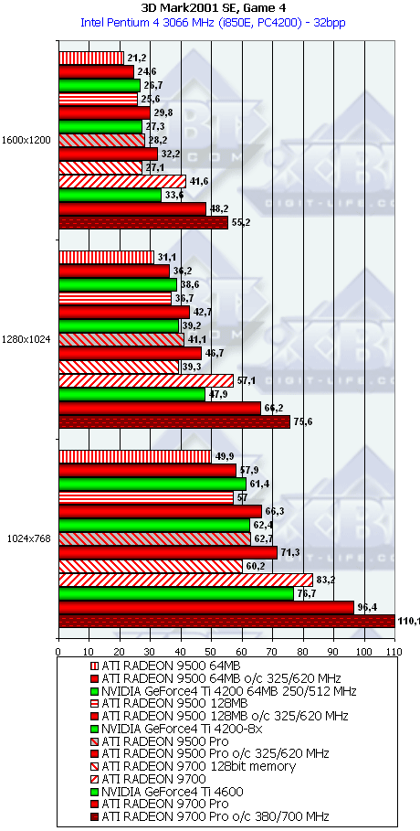 Этот тест настолько сложен, что включать АА и анизотропную фильтрацию в нем нет смысла. И так, как мы видим, скорость весьма мала. Что мы можем отметить? Проигрыш R9500 своим конкурентам (все же 4-х конвейеров для столь сложных сцен явно маловато), и разительные изменения, начиная с R9500 PRO. Да, очевидно, что здесь нужен мощный чип, а потом уже высокая ПСП. Хотя по цифрам превосходства R9700 PRO над Ti 4600 можно оценить и 256-битную шину.