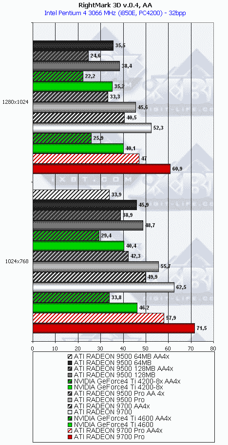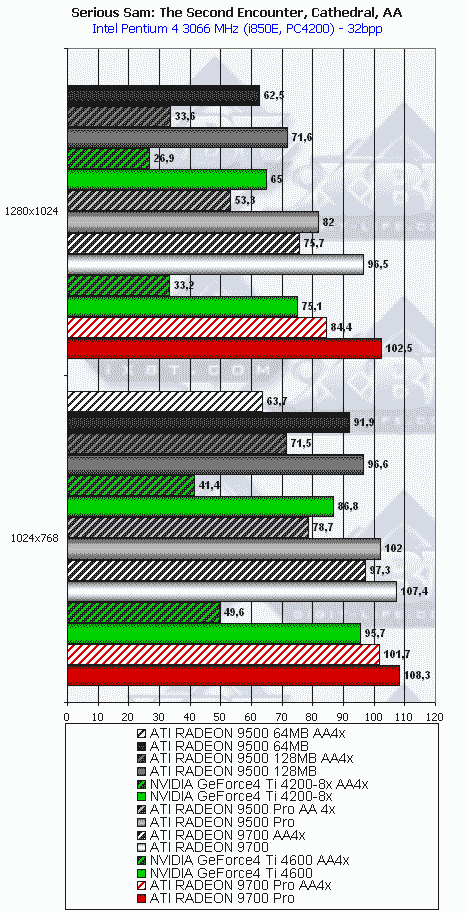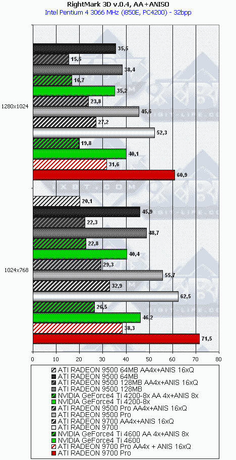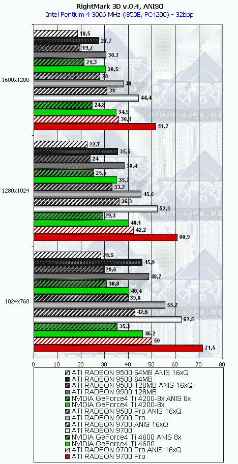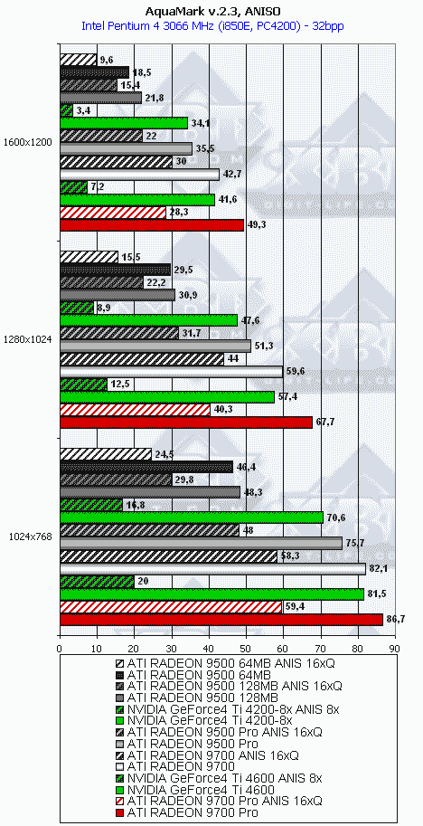 Что мы видим? Сильное поражение R9500 64MB (кроме режима с АА), чуть более отрадную картину у 128-мегового R9500 и очень хорошие результаты у R9500 PRO в режимах с АА и/или анизотропией. Монстры R9700 и R9700PRO успешно сражаются со своим соперником также в тяжелых условиях нагрузки АА и/или анизотропией.