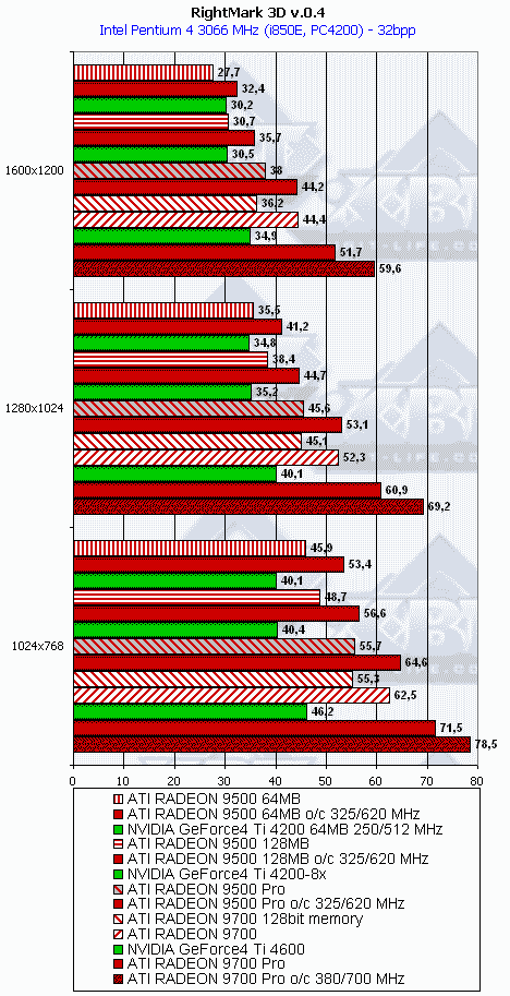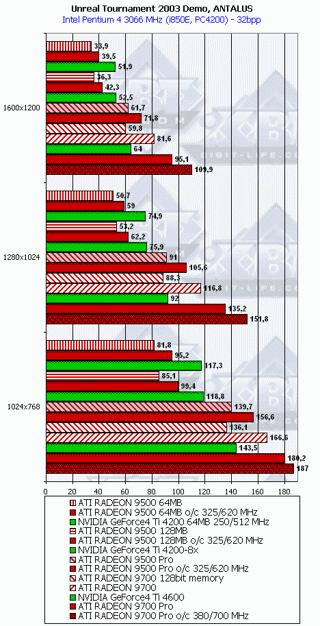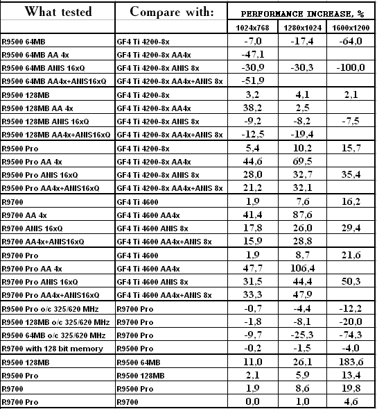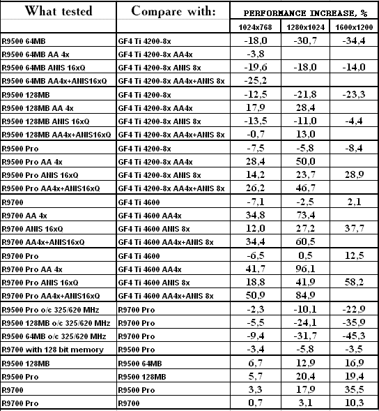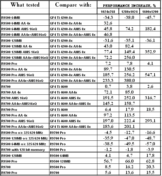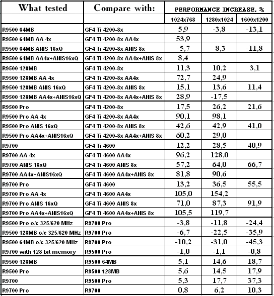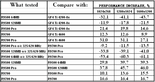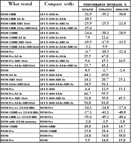 Перед анализом дам некоторую информацию. Автор RivaTuner-а, Алексей Николайчук (AKA Unwinder), помог модифицировать работу RADEON 9700, урезав шину до 128бит (то есть, по сути получив почти RADEON 9500 PRO). Тесты такой карты будут также представлены, и малая разница между R9700 128bit и R9500 PRO ярко еще раз доказывает наличие 128-битной шины у последнего.