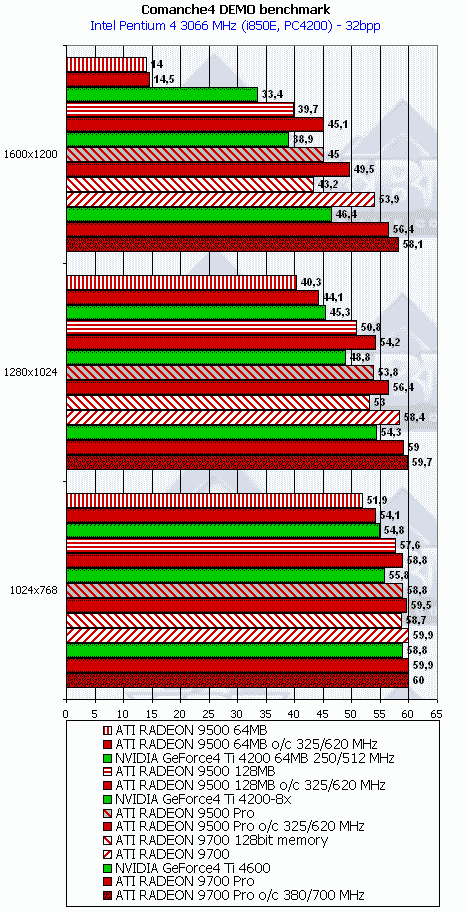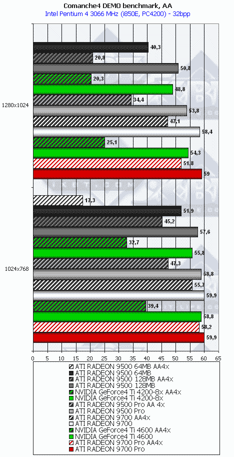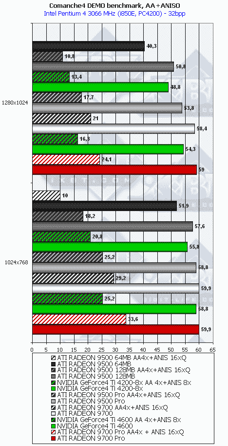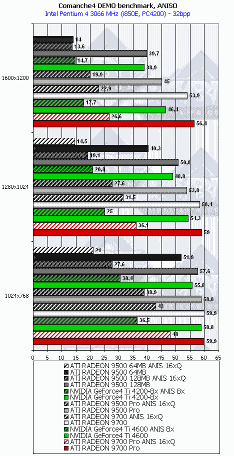 Перед нами прекрасные результаты у RADEON 9500 PRO (да и у R9500 128MB все весьма хорошо). Только 64 мегабайта у R9500 "подвели" эту карту в данном тесте (почему-то Comanche4 сильно невзлюбил карты с таким объемом памяти, хотя, судя по графике, там и 64-х мегабайт за глаза хватит для всех текстур и т.п.)