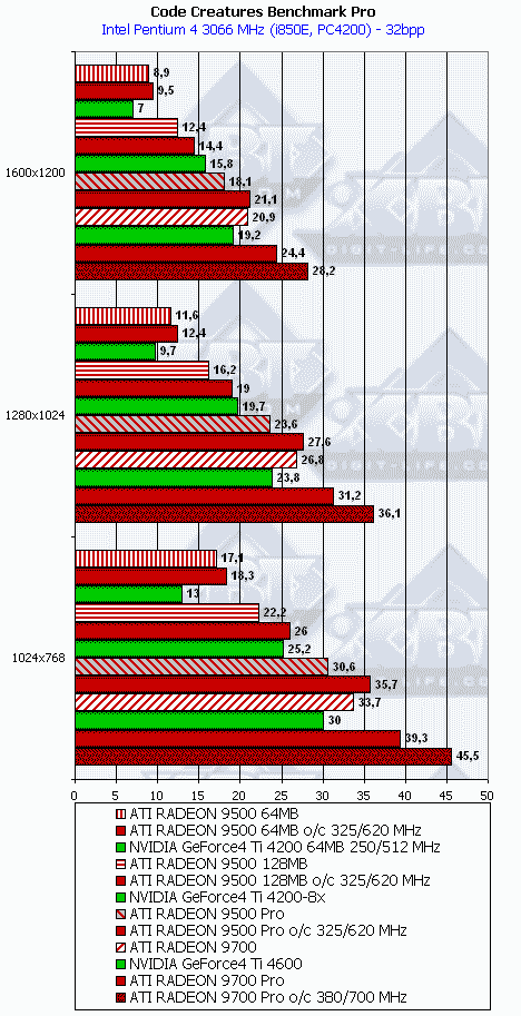 Замечу, что для разгона RADEON 9500 PRO мы использовали модифицированный BIOS, где снята защита от изменения частот. Найти его можно на http://www.rage3d.com. Для разгона RADEON 9700 PRO использовалась карта от Hercules с проведенной модернизацией чипа: