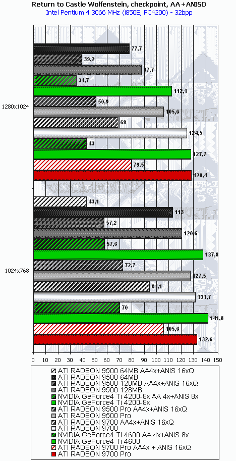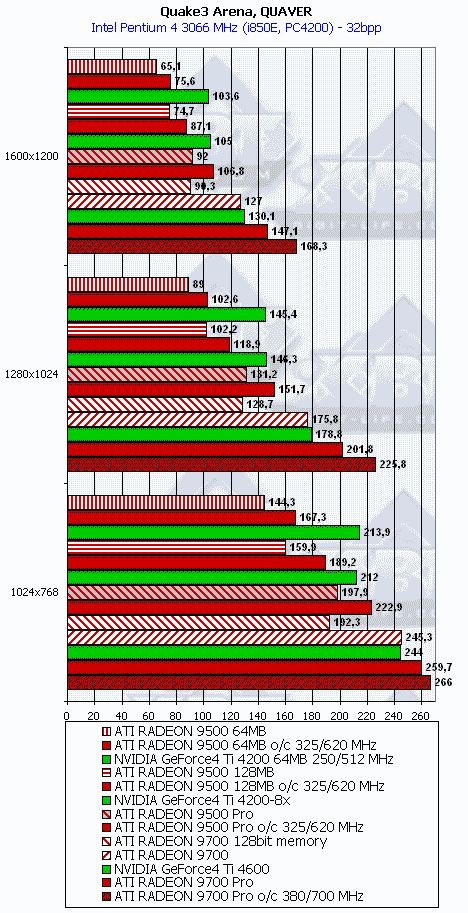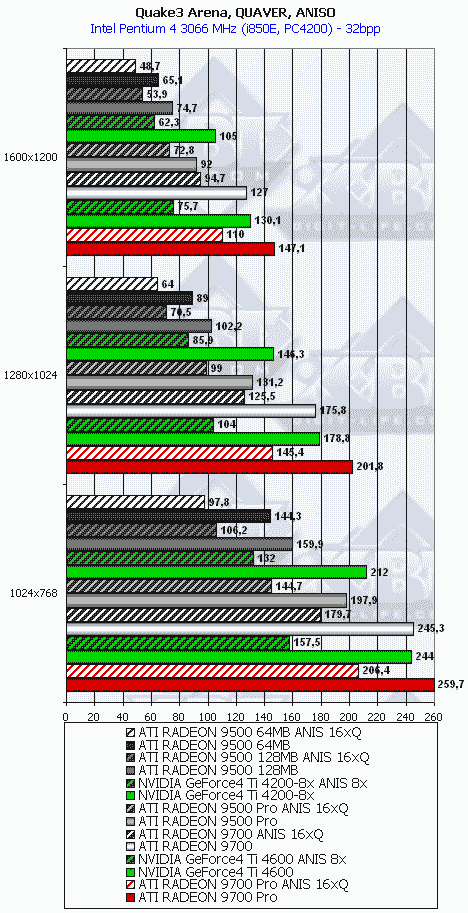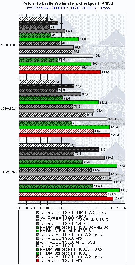 Да, мы видим, что у NVIDIA, как всегда, OpenGL-драйверы прекрасно…нет, не просто выполнены, а заточены под движок от Quake3, поэтому в данном тесте только RADEON 9500 PRO смог выйти ярким победителем.