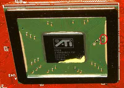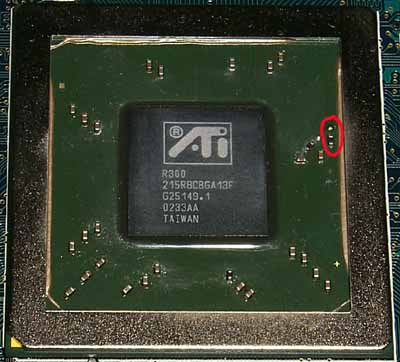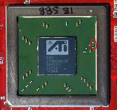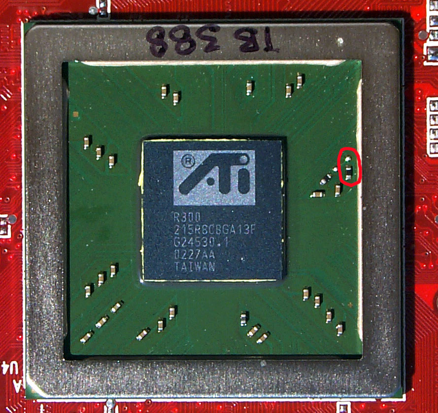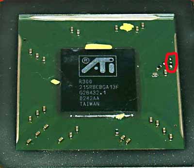 О взаимосвязи аппаратной переделки (перепайки) и программной. У R300 PCI DeviceID программируем через BIOS. У R9500PRO/R9700(PRO)  программируемы и старший и младший байты, поэтому при прошивке на R9500PRO BIOS'а от R9500 драйвер распознаёт карту как R9500 и использует только 4 пиксельных конвейера. У простого R9500 этот самый злополучный резистор на чипе запрещает программирование старшего байта PCI DeviceID, делающий невозможной подмену ID на уровне BIOS. Однако форсировать ID ну уровне драйвера нам ничего не мешает. Что и было сделано.