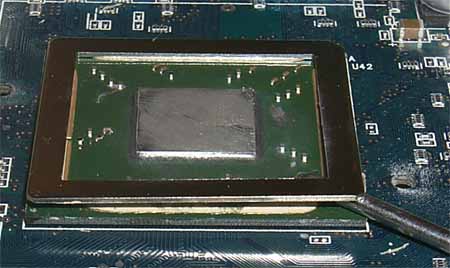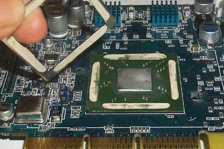 После снятия рамки кулер уже плотно прижимается к чипу, и мы получаем вместо 360 МГц разгон до 385 МГц (ради повышения стабильности, я снизил частоту до 380 МГц по чипу). Память же стабильно работала на 350 (700) МГц.