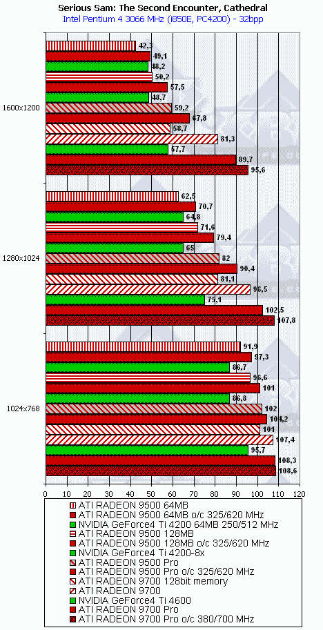 - Serious Sam: The Second Encounter v.1.05 (Croteam/GodGames)  OpenGL, мультитекстурирование, Grand Cathedral demo, настройки тестирования: quality, S3TC OFF