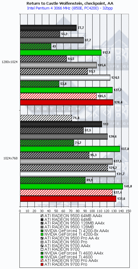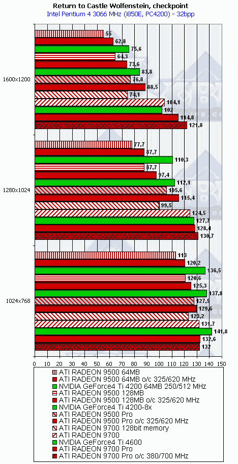 - Return to Castle Wolfenstein (MultiPlayer) (id Software/Activision)  OpenGL, мультитекстурирование, Checkpoint-demo, настройки тестирования  все на максимально возможном уровне, S3TC OFF, конфигурации можно скачать тут