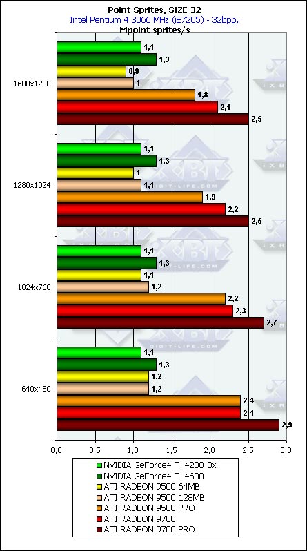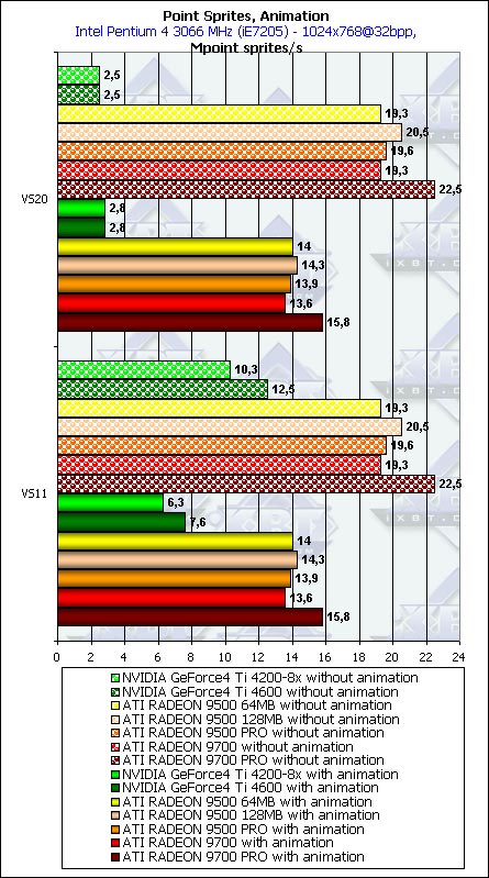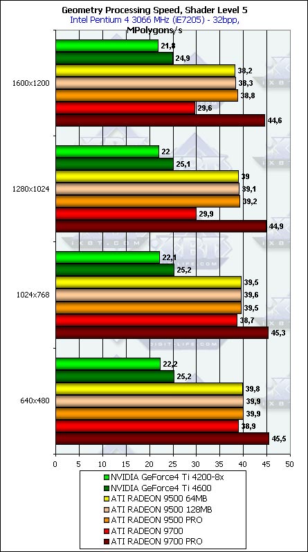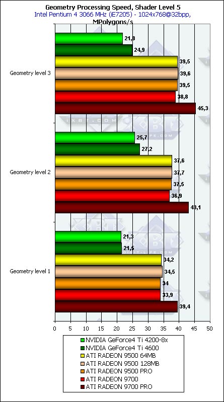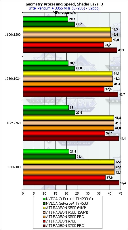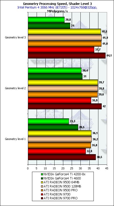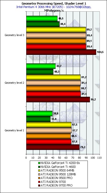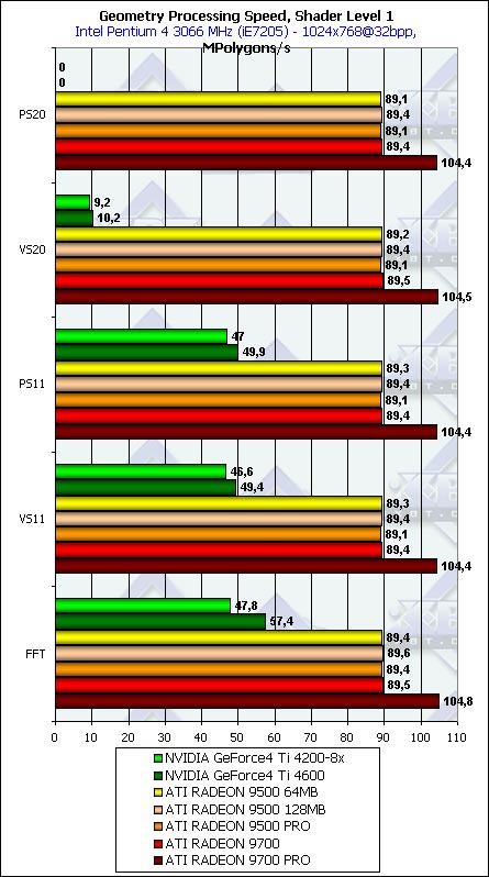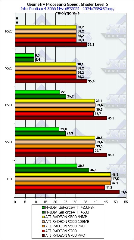 Непонятно также крайне небольшое, но постоянное отставание RADEON 9700 от всех вариантов 9500, но только в режимах эмуляции фиксированного T&L (FFT) и первой версии вершинных шейдеров.