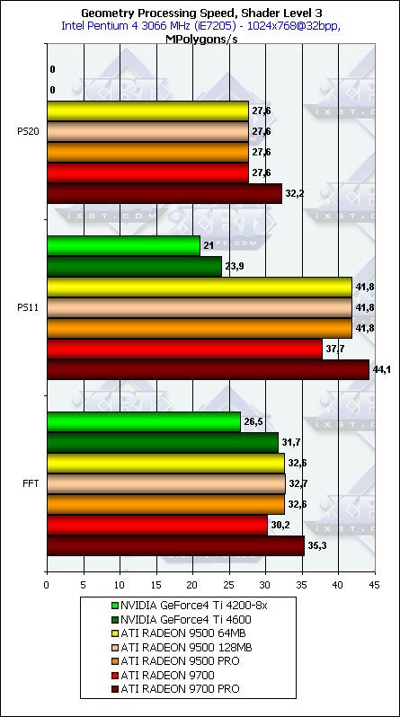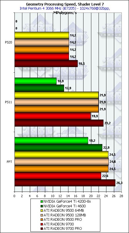 Картина повторяется, за исключением того, что здесь у обеих производителей FFT показывает себя чуть лучше вершинного шейдера. И вновь мы наблюдаем странное поведение RADEON 9700.
