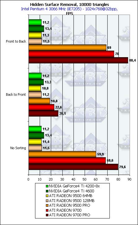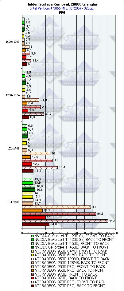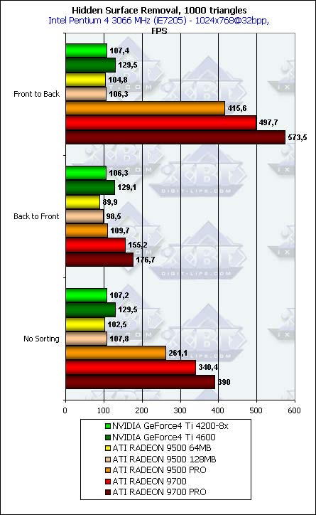 Даже в случае исходно хаотической сцены прирост есть, хотя и не столь высокий. Наиболее заметен он в случае небольшого числа полигонов. Вывод если хотите воспользоваться благами HSR (к несчастью, у половины чипов, как только что выяснилось, отключенного) сортируйте сцену перед выводом. Тогда и только тогда вам светит значительное, в несколько раз, преимущество. В случае же вывода неотсортированной сцены HSR сказывается, но не столь сильно от единиц до десятка процентов. Впрочем, портальные приложения, так или иначе, сортируют сцену при выводе, а к ним относится подавляющее большинство современных FPS движков. Поэтому, игра с HSR стоит свеч, в первую очередь именно для этого класса игр.