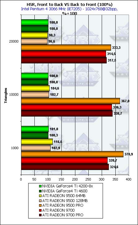 - Можно признать открытием факт блокировки HSR у обеих карт из семейства GeForce4 Ti, а также у всех карт семейства RADEON 9500. Ранее этот вопрос никем не исследовался и не поднимался, но, как говорится в известной пословице, «тайное всегда становится явным».