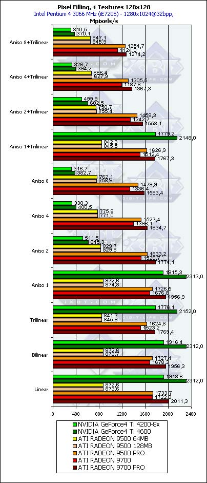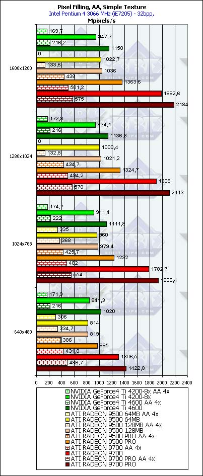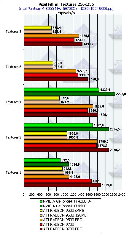 Продукт Теоретический максимум Измеренный максимум(2 текстуры) Измеренный максимум(макс. текстур) GeForce4 Ti 4200-8х 2000 1682 1839 GeForce4 Ti 4600 2400 2075 2223 RADEON 9500 128 1100 (4 TU!) 1055 678 RADEON 9500 PRO 2200 (128 бит!) 1799 1339 RADEON 9700 2200 1778 1233 RADEON 9700 PRO 2600 2070 1430 Хорошо видно, что при большом числе текстур (будущие приложения) ATI от памяти зависит мало (сравните последнюю колонку для 9500 PRO и 9700), а вот от числа конвейеров и тактовой частоты ядра — много; стимул включать конвейеры и разгонять ядро налицо.