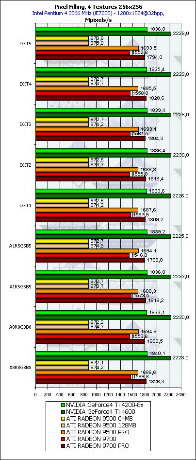 Результаты практически не меняются все чипы давным-давно оптимизированы для 32-битных текстур и выполняют распаковку сжатых текстур без каких-либо задержек. Впрочем, в будущих обзорах, в том числе и обзоре GeForce FX, мы уделим внимание сравнительно новым плавающим форматам буфера рендеринга и текстур, и там, судя по всему, нас будут ждать сюрпризы (с точки зрения влияния формата на скорость обработки).