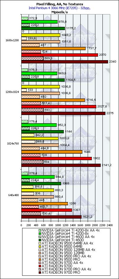 - Тест на скорость закраски буфера кадров (Pixel Fillrate). Закраска константным цветом выборка текстур не производится. Приведены результаты в миллионах пикселов в секунду для разных разрешений, причем как в обычном режиме, так и для 4х MSAA: