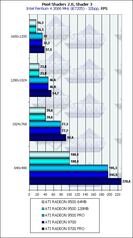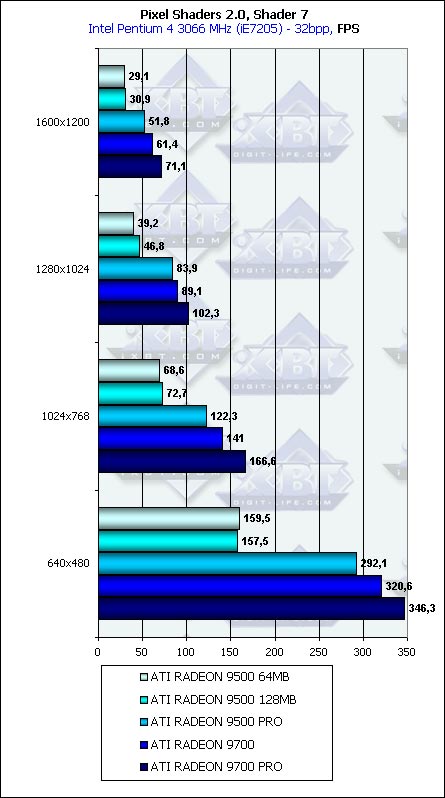 В данном тесте пока участвуют только продукты ATI т.к. аппаратное исполнение второй версии пиксельных шейдеров является минимальным требованием для этого теста. Судите сами: на старой доброй GeForce4 Ti 4600 вкупе с 2 ГГц Pentium 4 программная эмуляция второй версии пиксельных шейдеров выдает порядка одного кадра в две секунды. И это в маленьком окне.