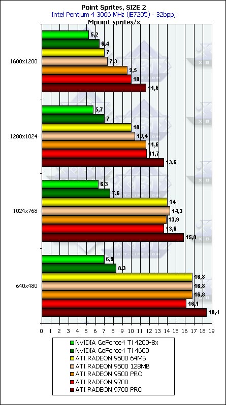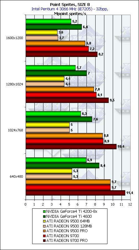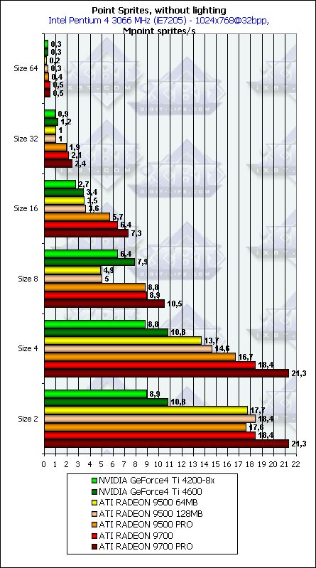 Как и ожидалось наличие или отсутствие освещения сказывается только на маленьких спрайтах, по мере роста размера все упирается в закраску. Происходит это при размере 8 и более. Итак, для вывода систем, состоящих из большого числа частиц, следует признать оптимальными размеры менее 8. Причем, NVIDIA показывает себя в плане зависимости от размера спрайтов гораздо лучше ATI падение не столь заметно, а до размера 8 включительно можно считать его монотонным и не очень большим. ATI же теряет бодрость духа уже между 4 и 8 и делает это весьма резко. Пиковые значения достигаются, разумеется, без освещения, и составляют соответственно чуть более 20 миллионов спрайтов в секунду для RADEON 9700 PRO и чуть более 10 для GeForce4 Ti 4600.