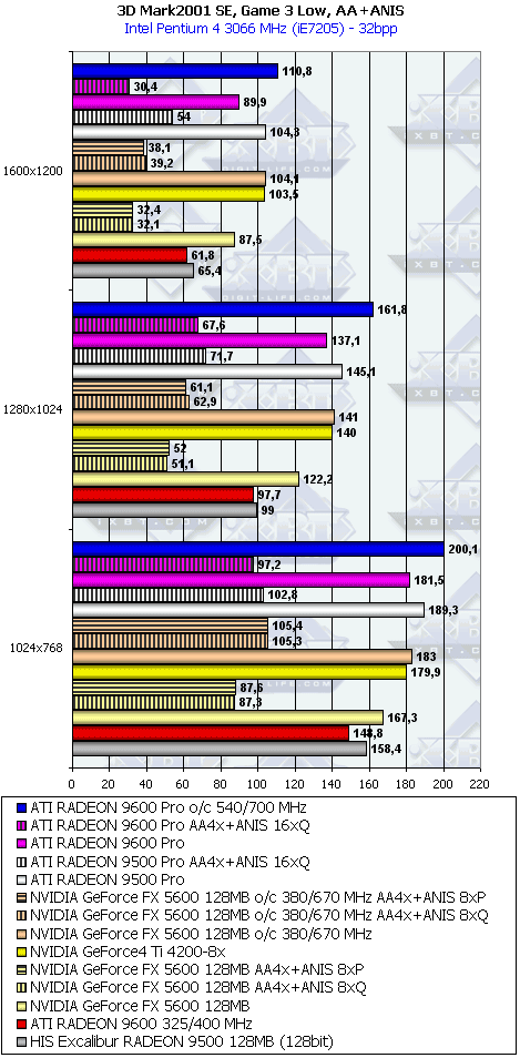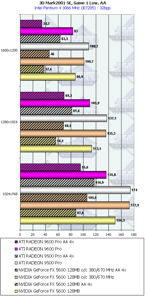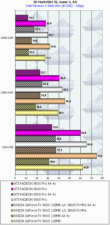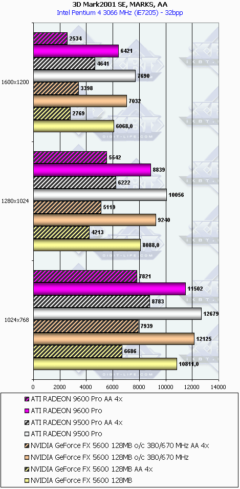 Подводя итоги тестирования в 3DMark2001SE, мы свидетельствуем, что несмотря на столь высокие частоты, RADEON 9600 PRO в большинстве тестов проиграл.