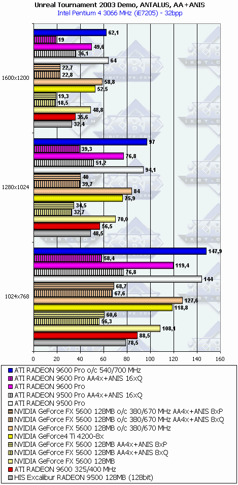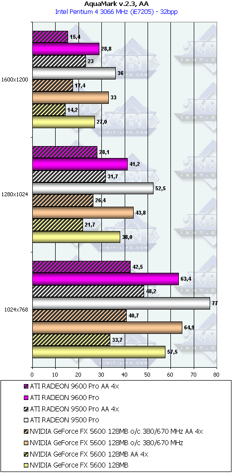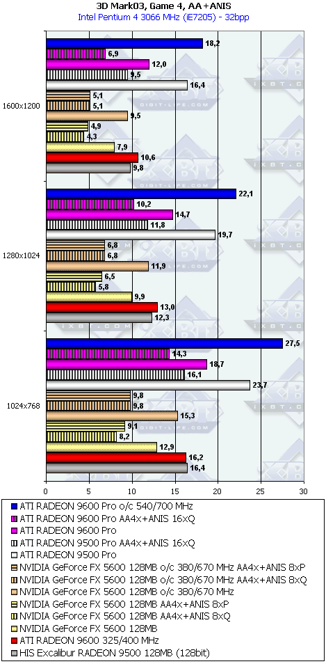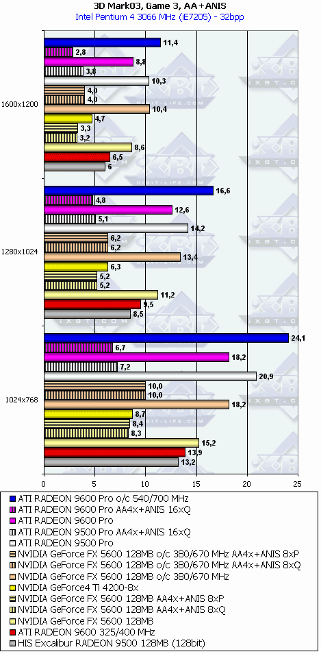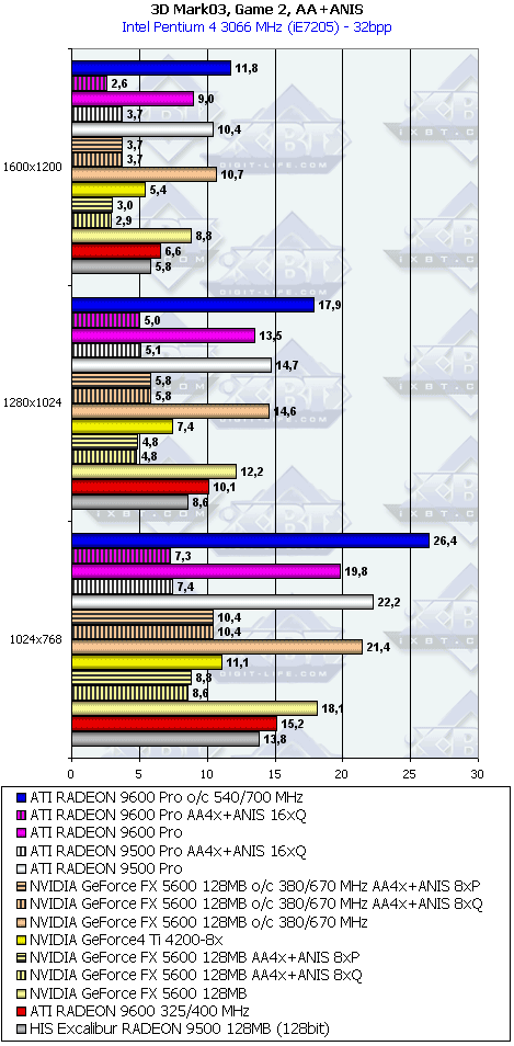 А вот тут картина полностью другая. Превосходство RADEON 9600 PRO весьма велико, особенно в режимах с АА. К сожалению, анизотропия все "скушала", и в самых тяжелых режимах детище ATI проигрывает сопернику.