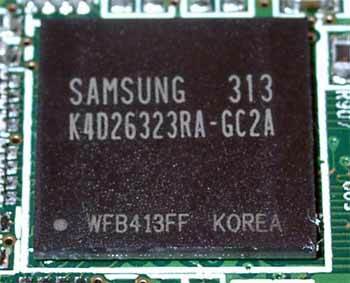 | На карте установлены микросхемы памяти Samsung марки K4D26323RA-GC2A, форм-фактора BGA. Максимальная частота работы 350 (700) МГц, поэтому можно сделать вывод, что время выборки 2.8 нс. По умолчанию память работает на частоте 300 (600) МГц, чип 400 МГц. | ![]() |
