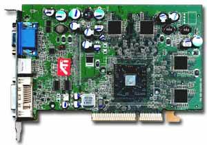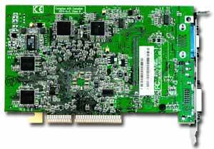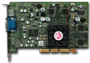 | Карта снабжена интерфейсом AGP х2/x4/x8, 128 МБ локальной памяти DDR SDRAM (восемь микросхем, размещенных на лицевой и оборотной сторонах PCB). | ![]() |