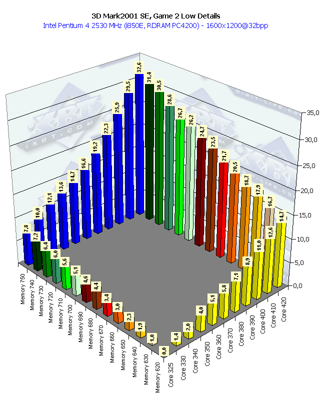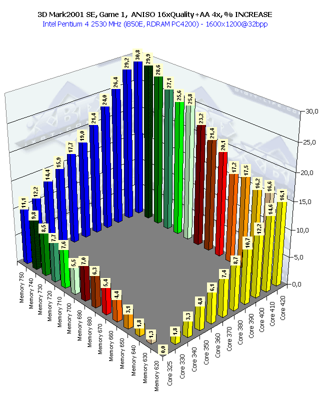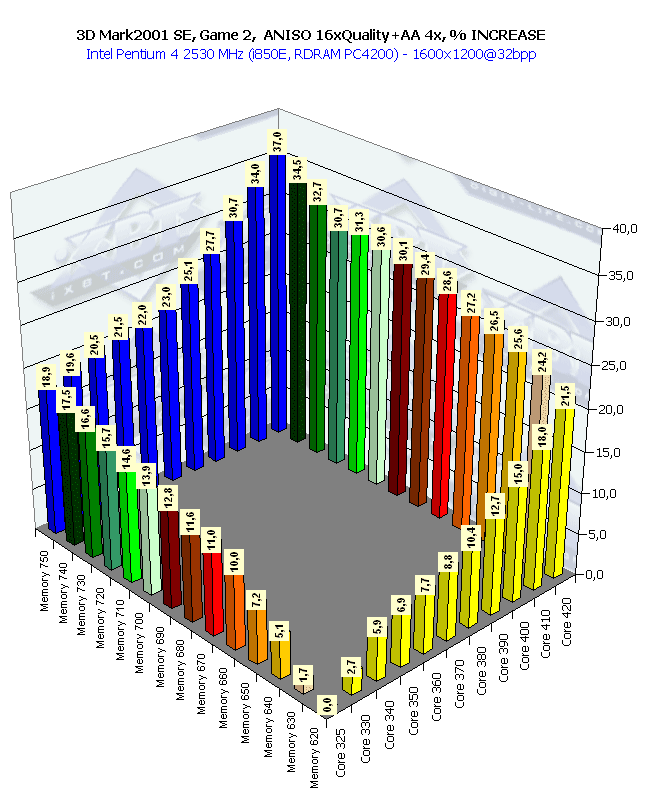 Интересный момент: четко сбалансированная работа чипа и памяти. Приросты частот памяти и процессора практически одинаково влияют на повышение производительности. И посмотрите на колоссальный прирост скорости в 61% (частота чипа выросла на 29%, частота памяти 21%).