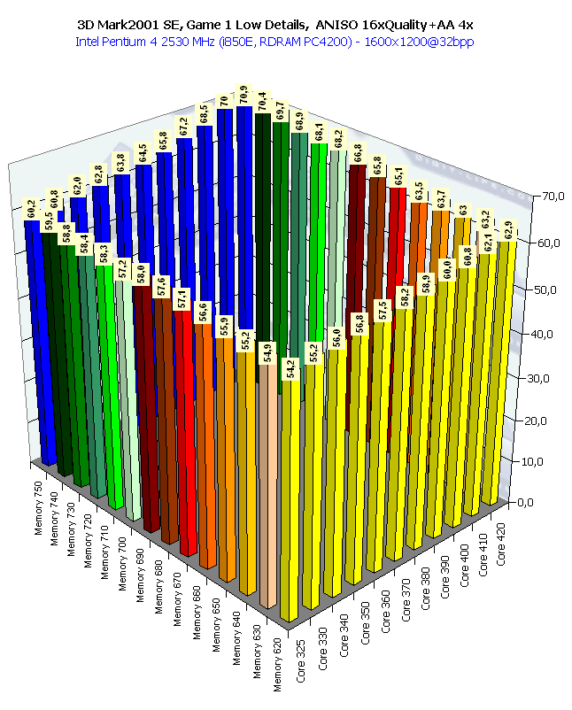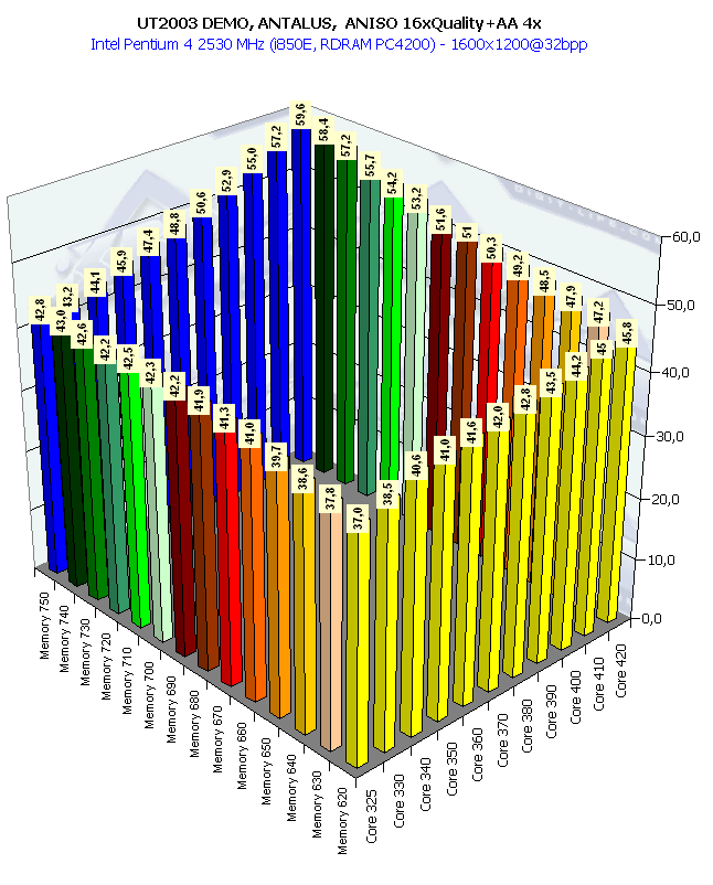 Собственно, картина та же самая, что и в 1024х768 при анизотропии и АА. Наиболее важным является прирост частоты памяти, поскольку АА "любит очень много кушать".