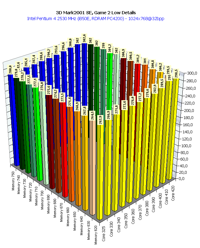 - 3DMark2001 SE Pro (MadOnion/Remedy), Game1, Game2 DirectX 8.0, Hardware TCL, мультитекстурирование, LOW Details, DXTC OFF, двойная буферизация, 24-битный Z-буфер