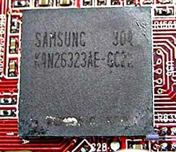 | Микросхемы памяти производства Samsung. Время выборки у микросхем памяти 2.2 ns, что соответствует частоте работы примерно 454 (908) МГц, память же работает на частоте 350 (700) МГц. Частота работы GPU  380 MHz. Интерфейс обмена с памятью  256 бит. |  |