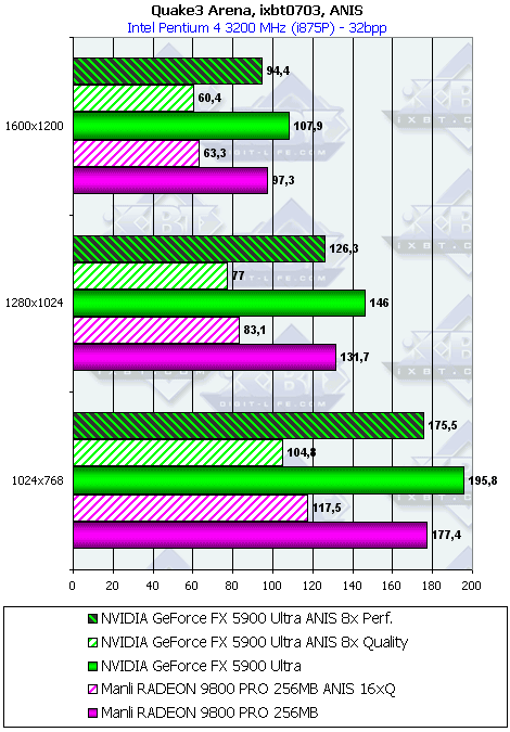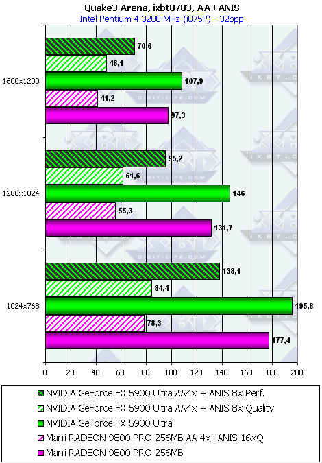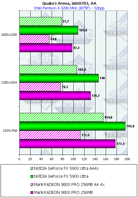 - Quake3 Arena v.1.17 (id Software/Activision)  OpenGL, мультитекстурирование, ixbt0703-demo, настройки тестирования все на максимальном уровне: уровень детализации  High, уровень детализации текстур  №4, S3TC OFF, плавность кривых поверхностей резко увеличена при помощи переменных r_subdivisions «1» и r_lodCurveError «30000» (подчеркну, что по умолчанию r_lodCurveError «250» !), конфигурации можно скачать тут