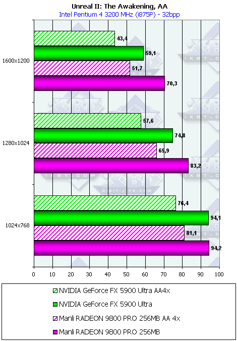 Душа поклонников ATI ну просто расцвела и сердце облилось бальзамом…. Да, это победа. Прошу еще раз обратить внимание на то, как сильно отличаются итоги тестов в этом случае и в случае UT2003. Я уже говорил ранее, что под UT2003 у NVIDIA есть оптимизации, а под Unreal II нет. Вот и результат. Где нет бенчмарков в открытом виде, там оптимизировать nVIDIA не стремится, ведь неинтересно же…