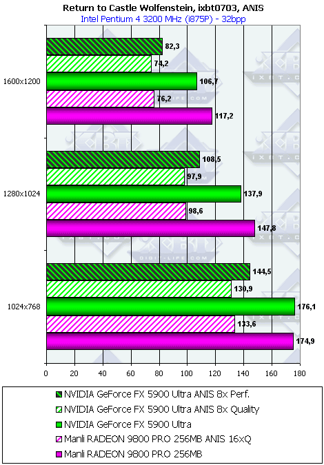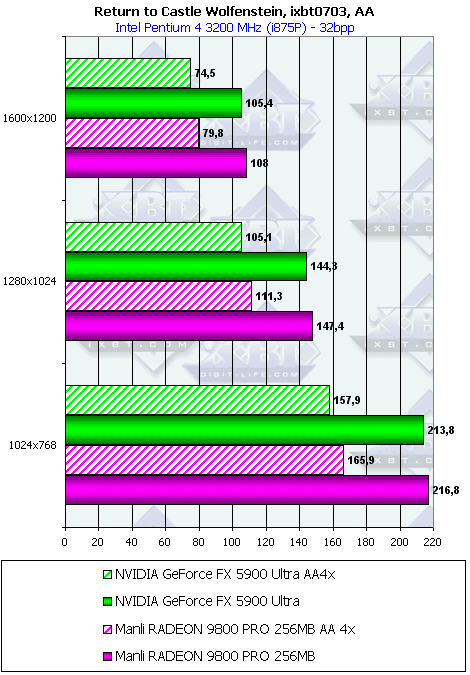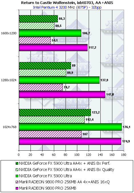 - Return to Castle Wolfenstein (MultiPlayer) (id Software/Activision)  OpenGL, мультитекстурирование, ixbt0703-demo, настройки тестирования  все на максимально возможном уровне, S3TC OFF, конфигурации можно скачать тут