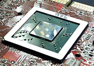 Раз мы сняли кулер, то можно оценить и размер кристалла. Он примерно такого же размера, как и R300, но зато имеет несколько иную подложку, придающую ему зеркальность. Упаковка кристалла такая же FCPGA.