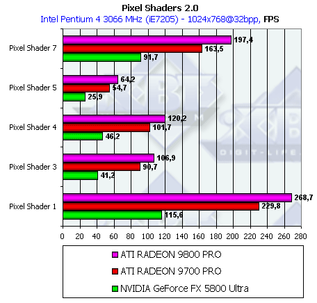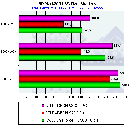 …ничего неожиданного рост производительности R350 в вопросе вторых пиксельных шейдеров опять хорошо соответствует росту тактовой частоты его ядра. В результате, проигрыш флагмана NVIDIA NV30 только усиливается.