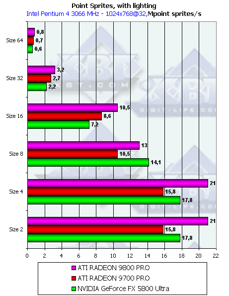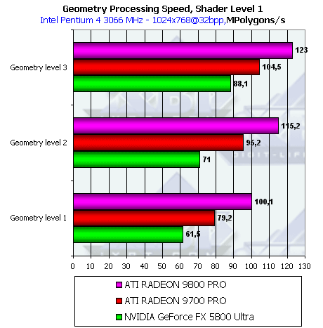 Разница слегка превышает разницу в частотах это следствие оптимизации вторых вершинных шейдеров. Теперь, в отличие от R300, NV30 проигрывает во всех режимах.
