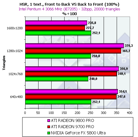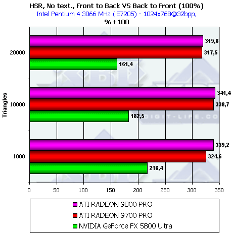 Как и ранее, в обзоре RADEON 9700 PRO, мы констатируем, что одноуровневый HSR NVIDIA предпочитает простые сцены, в то время как иерархический алгоритм ATI получает максимальное преимущество на сценах средней сложности, но наличие текстур уравнивает эти подходы, как в смысле характера закономерности, так и чуть более сближает их по эффективности. В идеальном пределе HSR алгоритм NVIDIA менее эффективен, но в реальной работе наличие текстур и раннего Z отсечения делает эту разницу не столь вопиющей.
