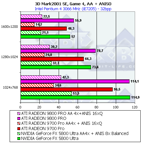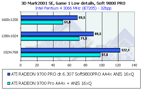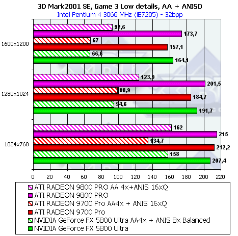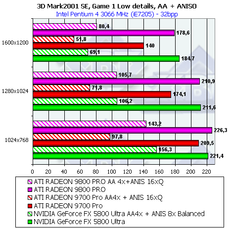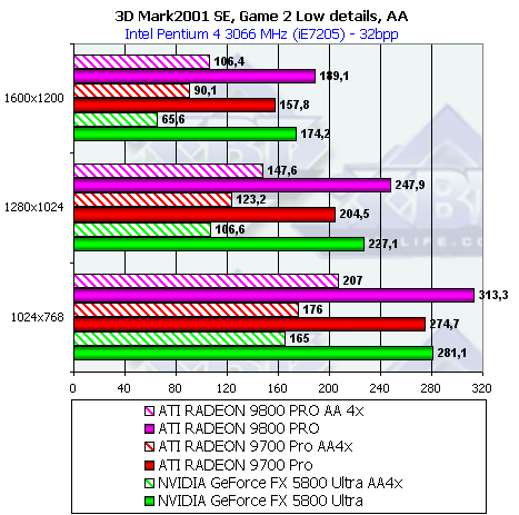 Обратим внимание на то, что форсирование RADEON 9800 при АА и анизотропии на RADEON 9700 PRO привело к существенному росту производительности относительно результатов самого RADEON 9700 PRO при АА и анизотропии. Заточка драйверов? Однозначно! Хотя без нагрузки АА и анизо прироста почти нет.