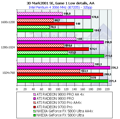 - Перевес RADEON 9800 PRO над GeForce FX 5800 Ultra не столь существенный в режимах без дополнительной нагрузки (иногда даже были проигрыши). Тяжелые режимы дают неоднозначную картину: от явных и сильных проигрышей (Game4) до таких успешных перевесов (до 40-50% в Game3, Game2). Ясно одно: благодаря 256-битной шине и более высокой ПСП у RADEON 9800 PRO очень хорошо смотрится АА.