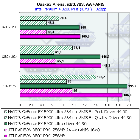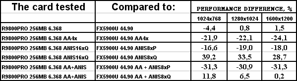 Ну примерный паритет. При сравнении с классом анизотропий Quality у RADEON 9800 скорость повыше, однако мы знаем, что качество самой функции у NVIDIA будет выше. А при сравнении с классом Performance, где у NVIDIA есть уже свои огрехи в виде упрощенной трилинейки и анизотропии на дальних объектах RADEON 9800 теряет лидерство.