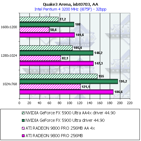 - Quake3 Arena v.1.17 (id Software/Activision) OpenGL, мультитекстурирование, ixbt0703-demo, настройки тестирования все на максимальном уровне: уровень детализации High, уровень детализации текстур №4, S3TC OFF, плавность кривых поверхностей резко увеличена при помощи переменных r_subdivisions «1» и r_lodCurveError «30000» (подчеркну, что по умолчанию r_lodCurveError «250» !), конфигурации можно скачать тут