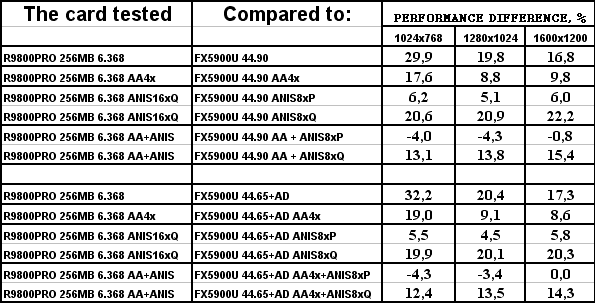 Ну здесь лидерство RADEON 9800 очевидно, оно есть в бОльшем числе случаев. Хотя надо отметить все же, что при сравнении анизотропии уровня Performance (NVIDIA)/Quality (ATI) GeForce FX 5900 берет верх своей оптимизацией самой анизотропки, плюс упрощением трилинейки. Это уже на выбор читателей кому что нравится.