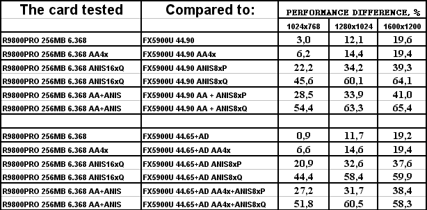 Очевидно, что ныне есть два самых мощных акселератора: RADEON 9800 PRO 256MB и GeForce FX 5900 Ultra. Но постепенное исследование тех или иных манипуляций в тестах со стороны nVIDIA ведет к тому, что RADEON 9800 PRO может стать где-то даже лидером. Единственное, что малопонятно, зачем переплачивать такие деньги за лишние 128 мегабайт. Скорость они увеличивают на мизерные проценты.