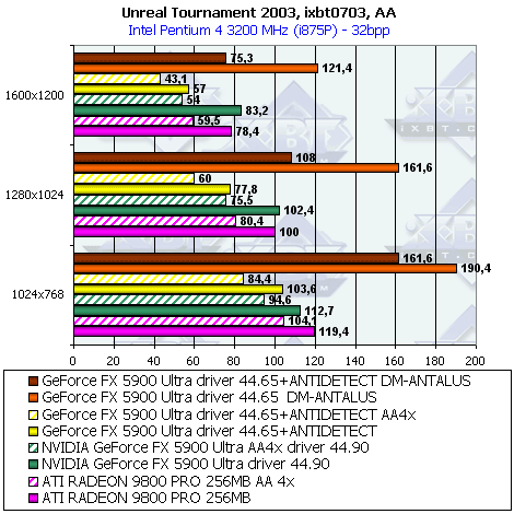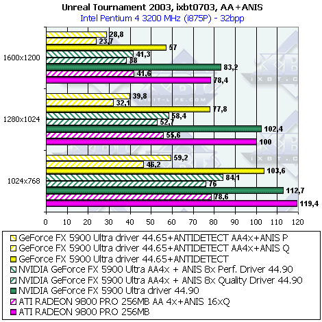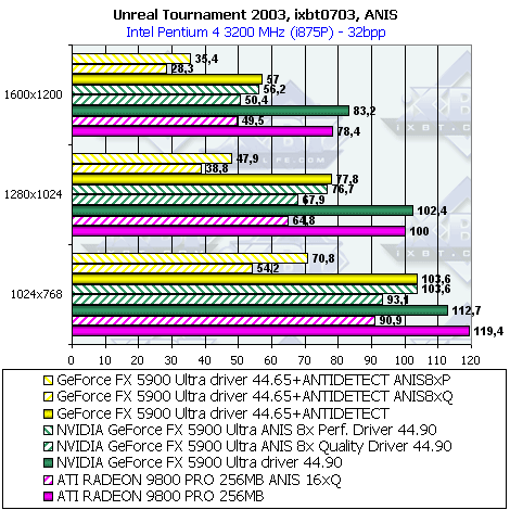 Вот мы и подошли к самому интересному на сегодня тесту. Но прежде посмотрим на скорости. Снова в целом видим примерный паритет (в каких-то режимах выигрыш у FX5900, в каких-то у RADEON 9800). При выключении оптимизаций у FX5900 его скорость резко падает, и выигрыш у RADEON 9800 просто колоссальный. Насчет того почему NVIDIA в UT2003 использует оптимизации, а в Unreal II (игра на том же движке) нет, мы уже говорили. Это действительно странно. Да, я напомню, что исследование с Anti-Detect по драйверам ATI показало, что заточек нет ни в одном игровом тесте (3DMark я не учитываю, ибо от него мы отказались). Именно поэтому результаты FX5900 с Anti-Detect мы смело можем сравнивать с результатами RADEON 9800 без оного.