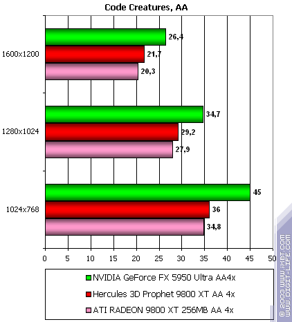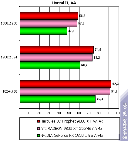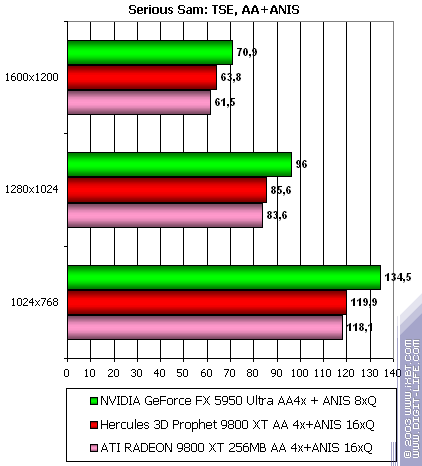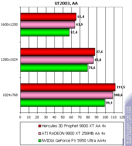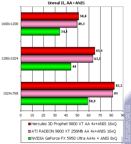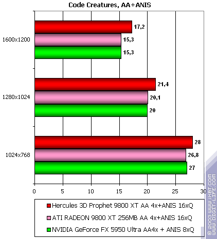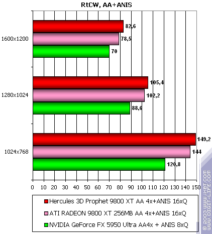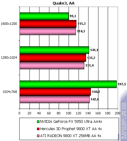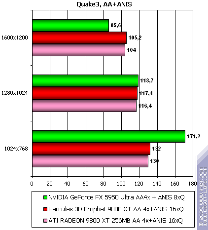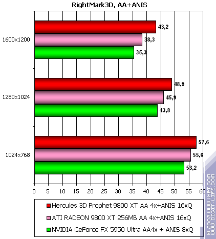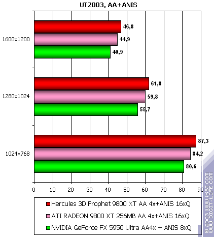 Итоговый самый тяжелый режим с АА и анизотропией: Hercules 9800 XT с трудом, но вырвал победу ( хотя играбельность в таком режиме никакая)